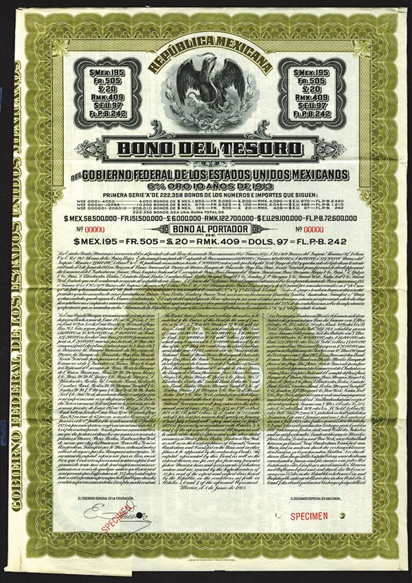 Mexico, 8th June 1913, 20 Pounds - 195 Pesos - 505 Francs, Specimen Bond, "Gobierno Federal De Los Estados Unidos Mexicanos", 6%, 10 Year Gold Bond of 1913. Black with olive green border and underprint, written in Spanish, French, English and German on face, XF condition. Rare specimen bond that has been cancelled, it in not issued and has only collector value, not speculator value. ABNC.