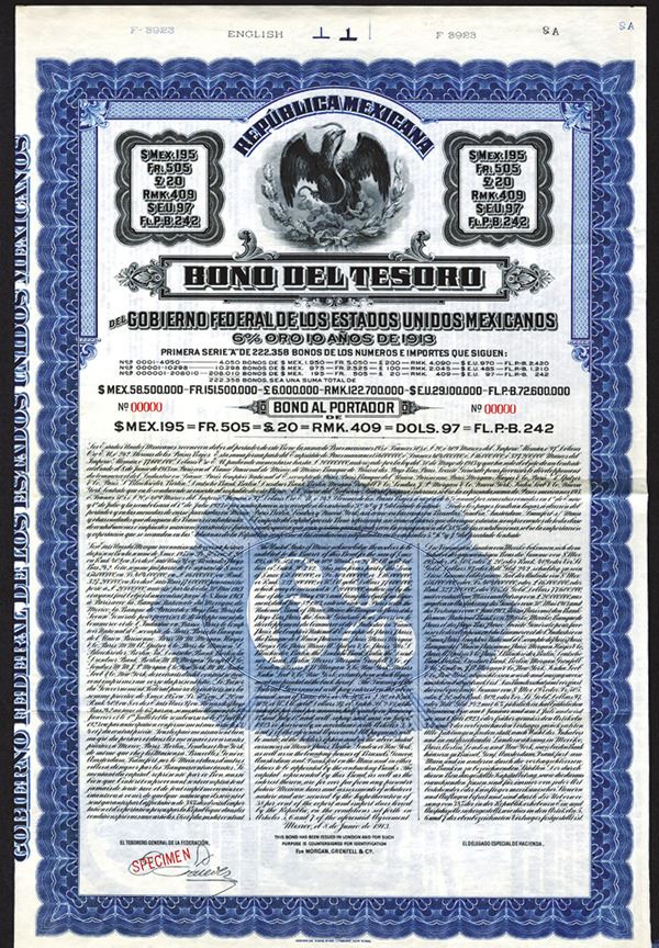 Mexico, 8th June 1913, 20 Pounds - 195 Pesos - 505 Francs, Specimen Bond, "Gobierno Federal De Los Estados Unidos Mexicanos", 6%, 10 Year Gold Bond of 1913. Black with blue border and underprint, large Arms of Mexico with Eagle holding snake in beak on cactus on top, coupons attached, Red specimen overprints, Punched out cancels, "00000" serial numbers, written in Spanish, French, English and German on face, XF condition. Rare specimen bond that has been cancelled, it in not issued and has only collector value, not speculator value. ABNC.