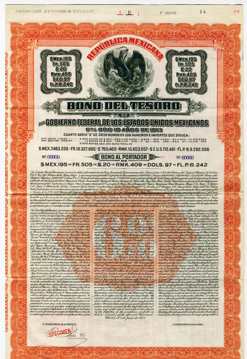 Mexico, 8th June 1913, $Mex.195 - 20 Pounds - 505 Francs, Specimen Bond, "Gobierno Federal De Los Estados Unidos Mexicanos", 6%, 10 Year Gold Bond of 1913. Black with red border and underprint, large Arms of Mexico with Eagle holding snake in beak on cactus on top, coupons attached, Red specimen overprints, Punched out cancels, "00000" serial numbers, written in Spanish, French, English and German on face, XF condition. Rare specimen bond that has been cancelled, it in not issued and has only collector value, not speculator value. ABNC.