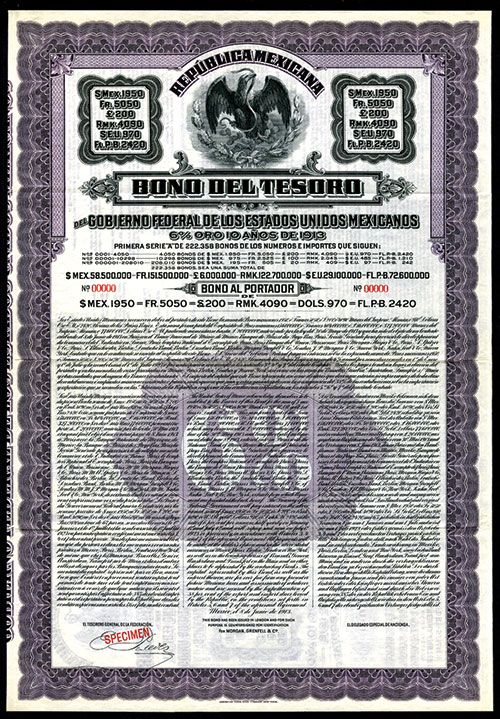 Mexico, 1913. 195 Pesos - 505 Francs - 20 Pounds Sterling - 409 RMK - $97. Serie A. 6% Gold bond. Arms of Mexico in middle with different currency amounts on left and right. Red border and undertint. Specimen overprints. Coupons attached. XF condition. ABNC. Scarce bond.