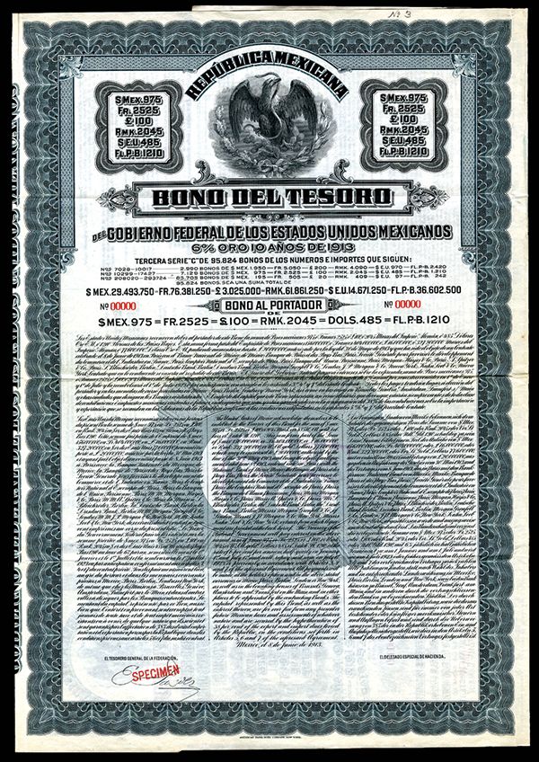 Republica Mexicana, Bono Del Tesoro Del Gobierno Federal De Los Estados Unidos Mexicano1913 Specimen Bond. Mexico, 1913. 975 Pesos - 2525 Francs - 100 Pounds Sterling - 2045 RMK - $485. Serie C. 6% Gold bond. Arms of Mexico in middle with different currency amounts on left and right. Blue border and undertint. Specimen overprints. Coupons attached. VF condition. ABNC. Scarce bond.