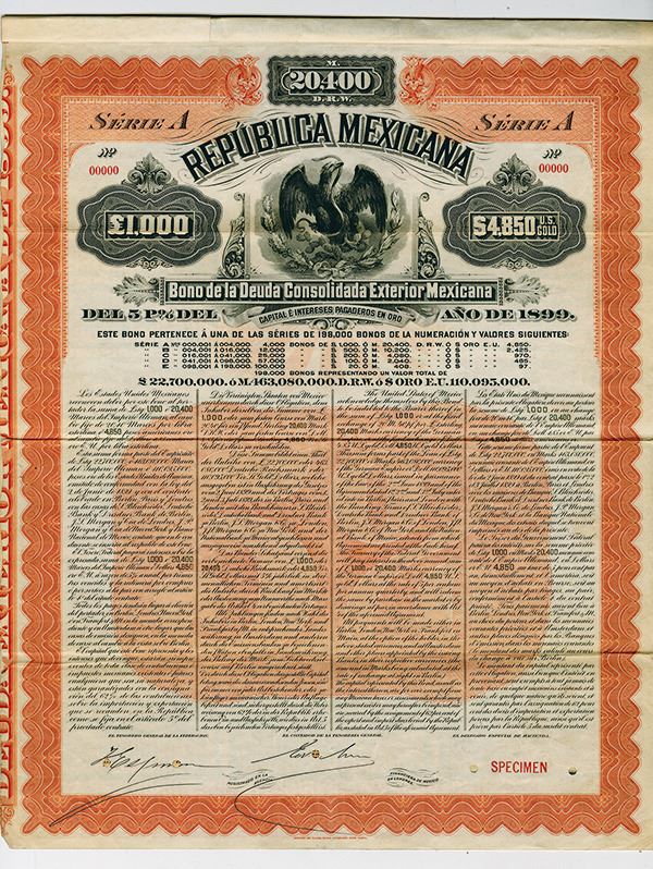 Mexico. £1000 = $4,850 Specimen 5% Serie A Coupon Bond, Black print on orange border and under tint printed in English, Spanish, German, and French, Seal of Mexico at top, Specimen overprints and POC's, VF-XF condition, ABNC.