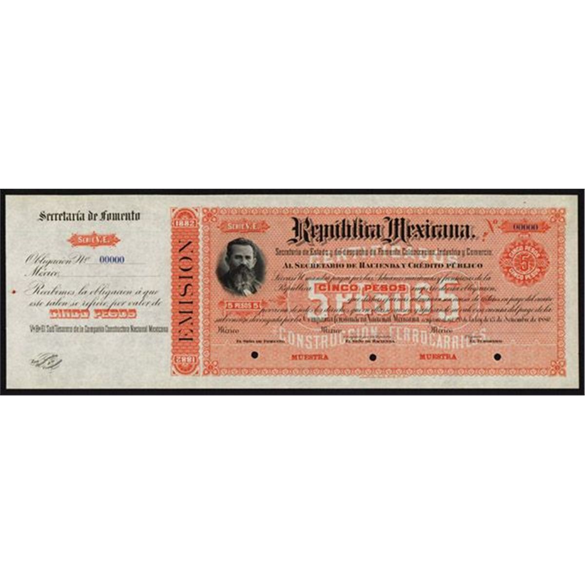 Mexico, 13 September 1880 (Emision 1882 on left), 5 Pesos, Serie V.E., P-Unlisted, Specimen Banknote, Black on red underprint with portrait of distinguished bearded man on left, Underprint has text Certificados Construccion de Ferrocarriles as underprint, back has small print in red describing terms of the banknote, Muestra Overprints, POC's, 00000 Serial numbers, POC's, counterfoil on left still attached, Constructora Nacional Mexicana. 14 x 5 inches. Choice to Gem Uncirculated condition. ABNC. Extremely rare and attractive Mexican Fiscal document - Banknote.