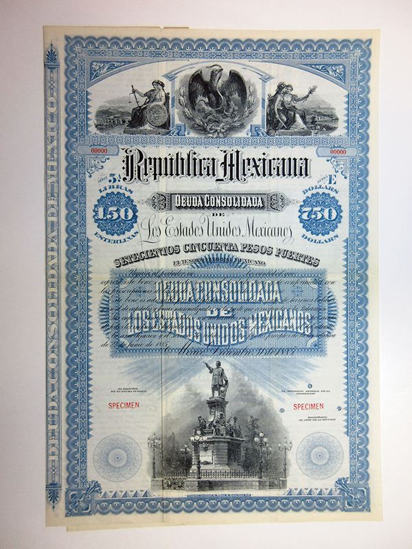 Mexico. $750 Specimen Bond. Series 5A Letra E, Black text and vignette with blue ornate border and under print with all coupons attached. Mexican arms of eagle with snake on cactus flanked by allegorical women on left and right with large monument at bottom of certificate. Specimen overprints, POC's, ABNC, rare and attractive. Only 3 of this denomination was found in 2002 in the ABN archives.
