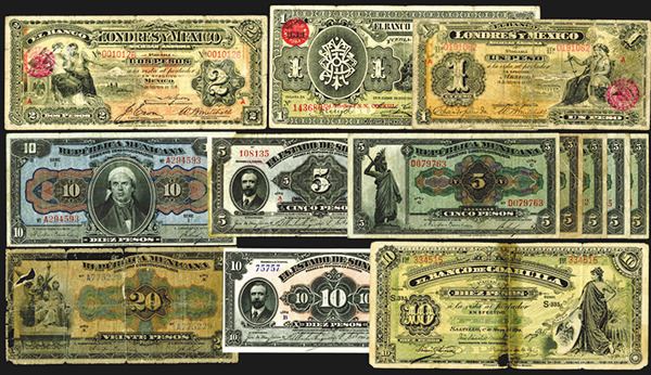 Mexico. Estado de Sonora, Hermosillo, 5, 10 Pesos. SCWPM S1072, 1073. Very Good-Fine; Banco de Londres y Mexico 1, 2 Pesos; Banco de Coahuila 10 Pesos; Banco Oriental de Mexico 1 Peso; Republica Mexicana 5, 10, 20 Pesos. Mostly Good or so, some with paper separation. 13 pieces total.