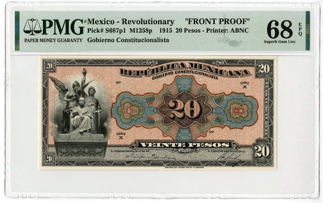 Mexico, 1915. 20 Pesos, P-S687p1 M1258p, Front Proof. Printed on india paper that is unmounted, Black with pale orange and m/c with monument to Juarez at left. PMG graded Superb Gem Uncirculated 68 EPQ.