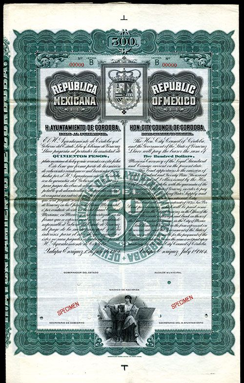 Mexico, 1904. 500 Pesos. 6%. Green border. Vignette of Arms of Veracruz on top and allegorical woman and child on bottom. Red SPECIMEN overprint and POC. Drinking water and sewage bond. Coupons attached. XF Condition. ABNC. Scarce variety.