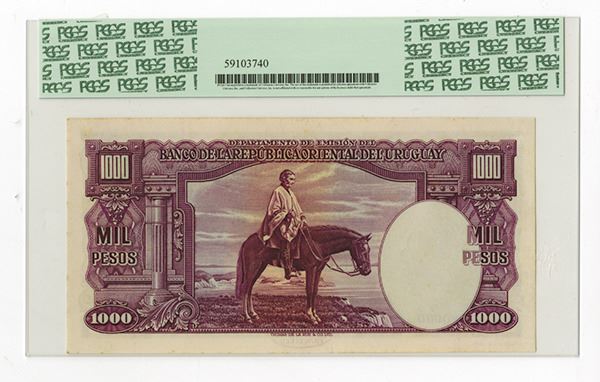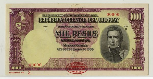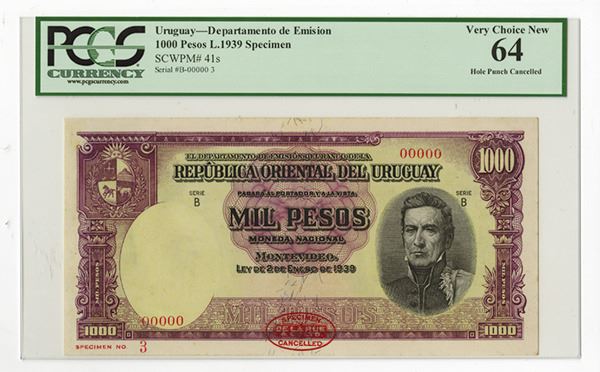Uruguay. 1939 (1967), 1000 Pesos, Ser.B, P-41s unlisted as a Specimen Banknote, S/N 00000 - Specimen No.3, Oval TDLR overprint on middle bottom, PCGS graded Very Choice New 64, POC, TDLR.