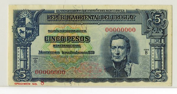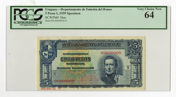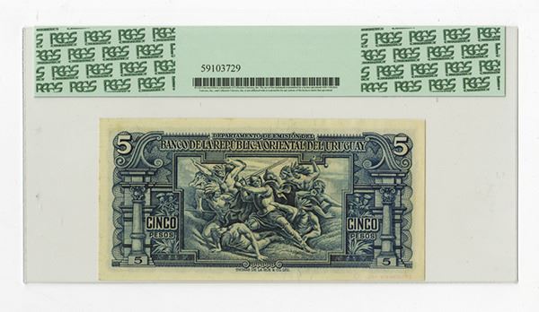 Uruguay. 1939, 5 Pesos, P-36as Unlisted as a Specimen Banknote, Oval TDLR overprint on middle bottom, PCGS graded Very Choice New 64, TDLR.