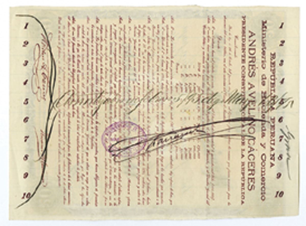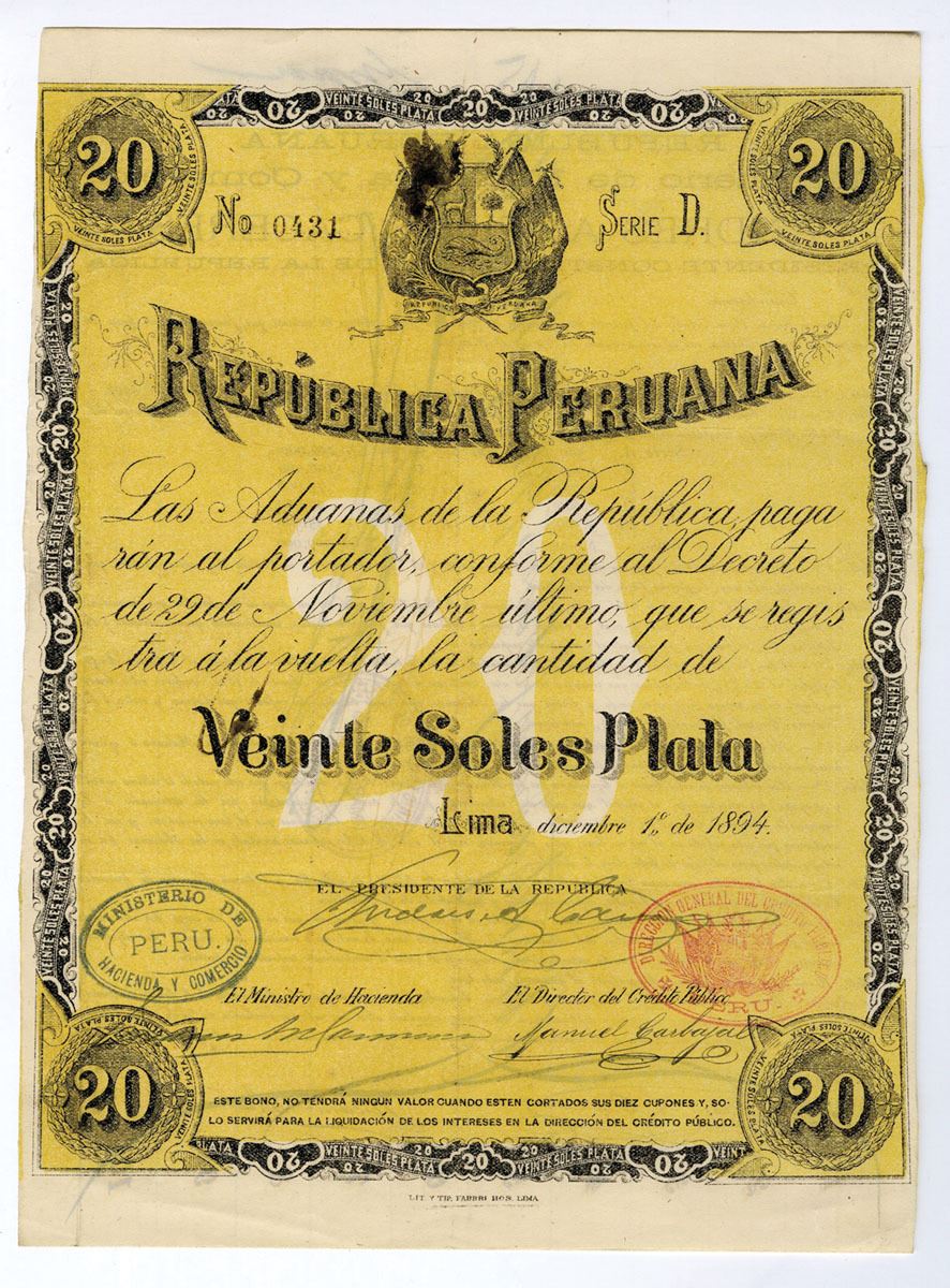 Lima, Peru. 20 Soles, 1894.Series D, Issued, no coupons, Black on yellow underprint, Peru arms at top, hand stamped multiple times. Very Fine.