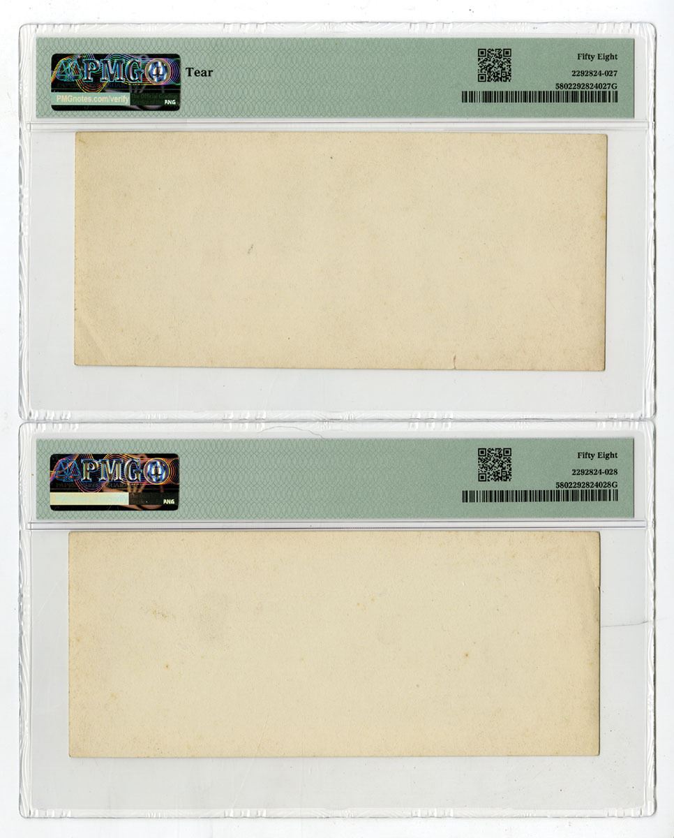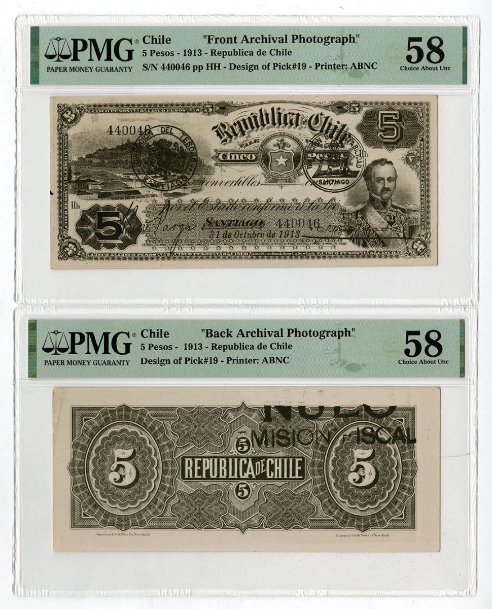 Chile, 1913. 5 Pesos, P-19bp Unlisted, Obverse and Reverse Photo Proofs, Black and white photos printed on glossy paper, Obverse shows village landscape at top left with seal of Chile at center, and portrait of Gen. R. Freire at lower right, Reverse shows guilloches with denomination at either side, Front has S/N 440046, Reverse has "Emision Fiscal" stamp over back, Both are PMG graded Choice About Unc 58 with Obverse having comment "Tear," ABNC. All are photo proofs of original specimen or proof notes that were by different printers to be used for reference or they were used during the production process to determine if the design and text were correct and also to be used for approvals and their printing records. These were from the Thomas De La Rue production and design department. (2).