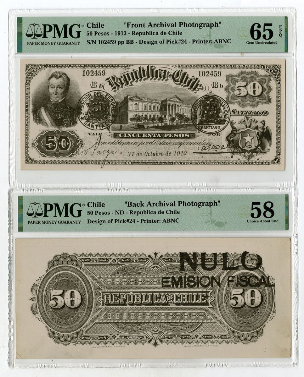 Chile, 1913. 50 Pesos, P-24bp Unlisted, Obverse and Reverse Photo Proofs, Black and white photos printed on glossy paper, Obverse shows Man in uniform at left with building at center and national arms at lower right, Reverse shows guilloches with denomination at either side, Front has S/N 102459, Reverse has "Emision Fiscal" stamp over back. Both are PMG graded: Obverse is Gem Unc 65 EPQ & Reverse is Choice About Unc 58 with comment "Tear, "ABNC. All are photo proofs of original specimen or proof notes that were by different printers to be used for reference or they were used during the production process to determine if the design and text were correct and also to be used for approvals and their printing records. These were from the Thomas De La Rue production and design department. XF to Uncirculated condition. (2). Sold "AS IS" no returns accepted.