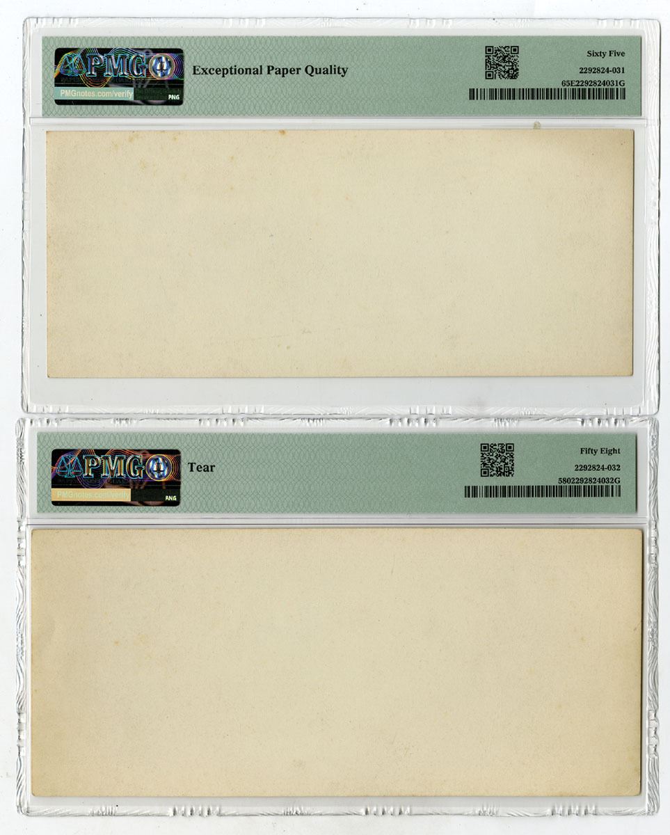 Chile, 1913. 50 Pesos, P-24bp Unlisted, Obverse and Reverse Photo Proofs, Black and white photos printed on glossy paper, Obverse shows Man in uniform at left with building at center and national arms at lower right, Reverse shows guilloches with denomination at either side, Front has S/N 102459, Reverse has "Emision Fiscal" stamp over back. Both are PMG graded: Obverse is Gem Unc 65 EPQ & Reverse is Choice About Unc 58 with comment "Tear, "ABNC. All are photo proofs of original specimen or proof notes that were by different printers to be used for reference or they were used during the production process to determine if the design and text were correct and also to be used for approvals and their printing records. These were from the Thomas De La Rue production and design department. XF to Uncirculated condition. (2). Sold "AS IS" no returns accepted.
