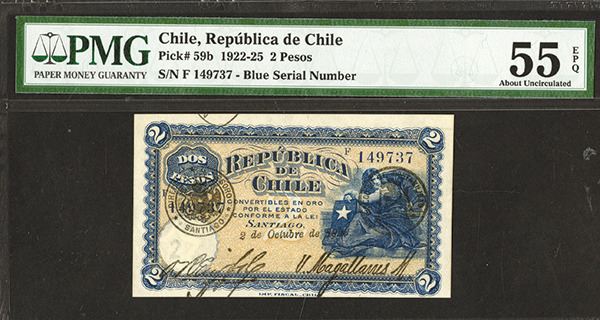 Santiago, Chile, 2 Pesos, P-59b Unlisted date of October 2nd, 1926, Issued banknote, Blue serial number, Blue on light orange underprint (Listed as light yellow in SCWPM), PMG graded About Uncirculated 55 EPQ, Very possibly a discover later date.