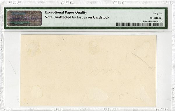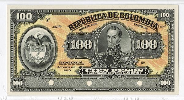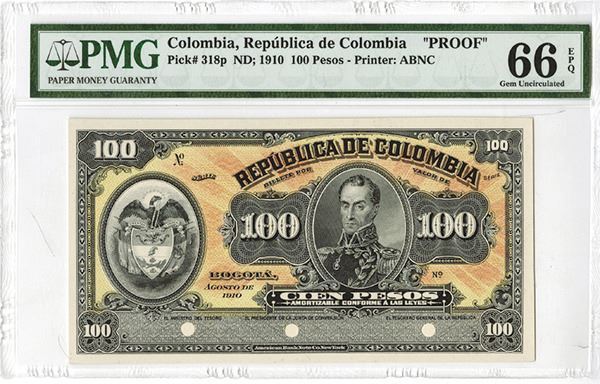 Bogota, Colombia. 100 Pesos, P-318p Proof Uniface Front banknote, no back, black on orange and yellow undertint, Arms on left, Bolivar at right, PMG graded Gem Uncirculated 66 EPQ. Unlisted as a proof in SCWPM. ABNC. Only 2 notes grade higher out of 17 graded in the PMG census.