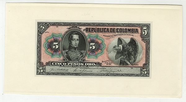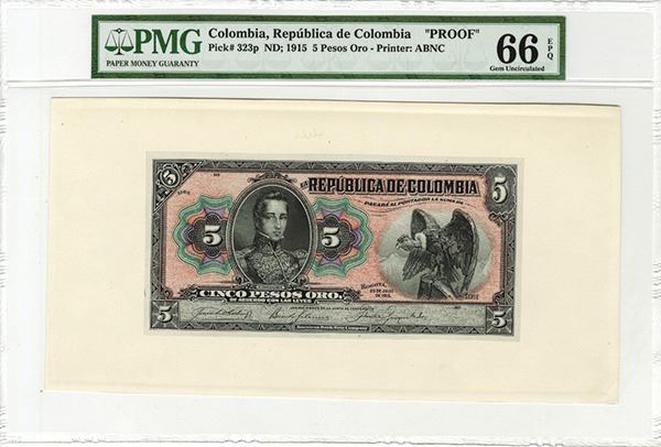 Bogota, Colombia. 5 Peso, P-323p Proof Uniface Front banknote, no back, black on orange and m/c undertint, Cordoba at left, Condor at right, PMG graded Gem Unc. 66 EPQ. Unlisted as a proof in SCWPM. ABNC. Only 1 note grades higher in the PMG census out of 22 graded.