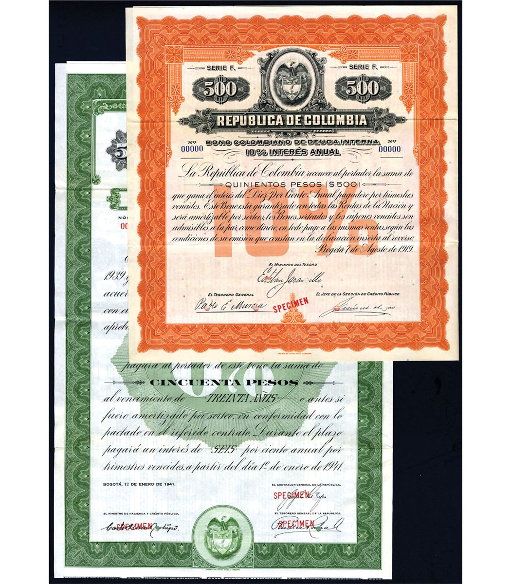 Colombia, Lot of 2 bonds, Includes 1919, 500 Pesos, 10% Bono Colombiano De Deuda Interna, Coupon bond, orange border; and 1941, 50 Pesos, 6%, Clase "A", Deuda Nacional Unificada specimen. Both in VF to XF condition. ABNC.