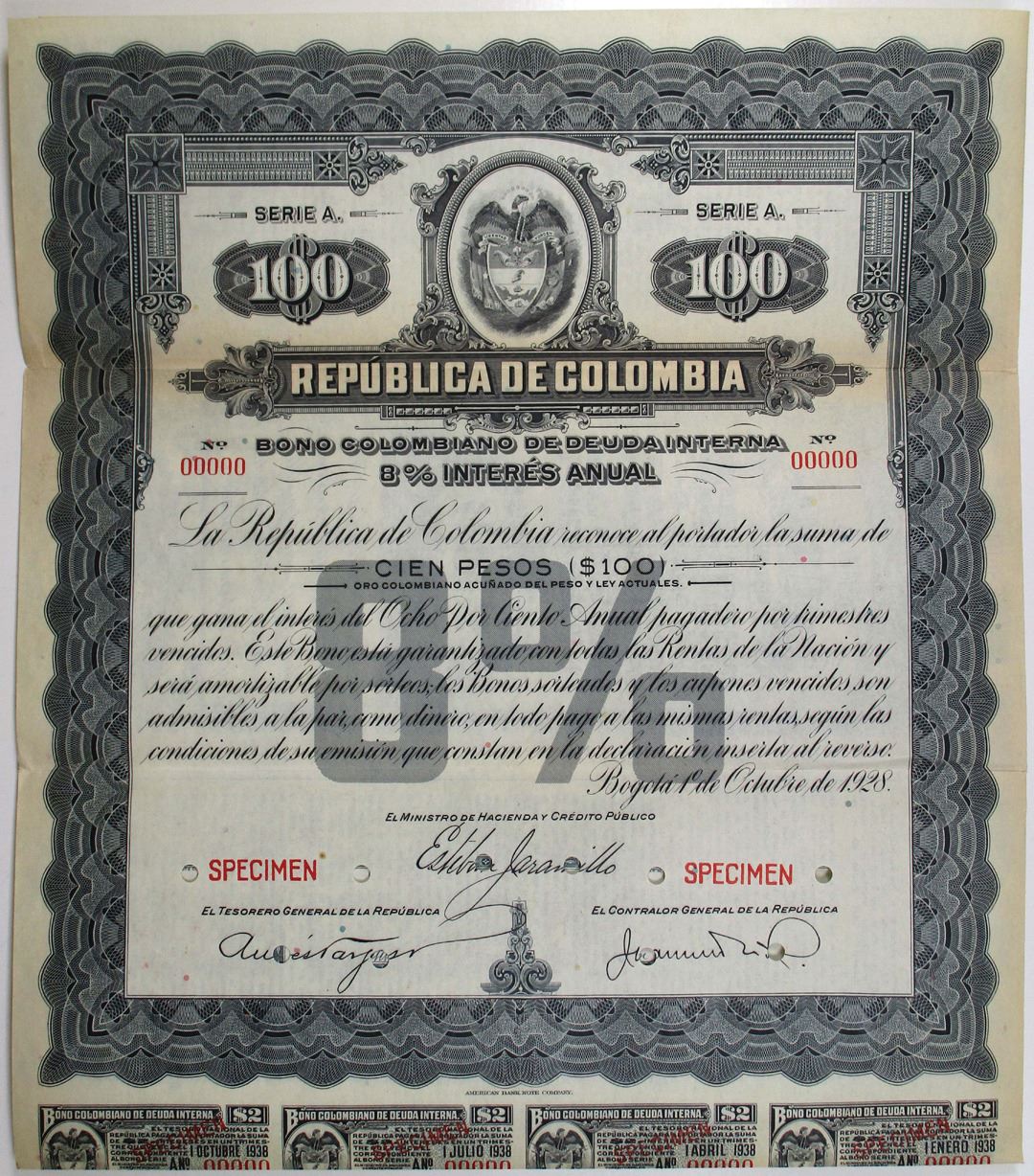 Colombia, 1928. 100 Pesos Specimen 8% Coupon Bond in Spanish, Black text with blue border and underprint, Colombian coat of arms at top center. Red specimen overprints, 00000 serial numbers, and POCs. VF condition, ABNC.