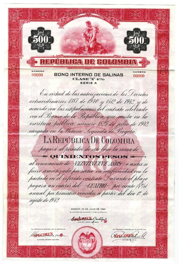 Columbia. $500 Specimen 4% Serie A Bono Interno de Salinas Bond, Black print on red border and under tint printed in Spanish, Allegorical figure with mining equipment at top pf a mountain, Specimen overprints and POC's, VF-XF condition, ABNC.