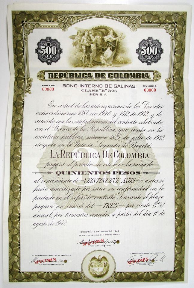 Colombia, 1942. 500 Pesos Specimen 3% Coupon Bond in Spanish, Black text with olive border and undertint, Quartet of allegorical figures with large gear in background at top center. Red specimen overprints, 00000 serial numbers, and POCs. VF condition, ABNC.