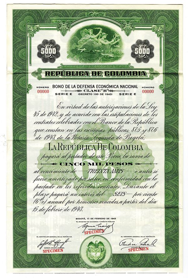 Columbia. $5,000 Specimen 6% Serie E Coupon Bond, Black print on green border and under tint, Allegorical figures with modes of transportation at top, Specimen overprints and POC's, VF-XF condition, ABNC.