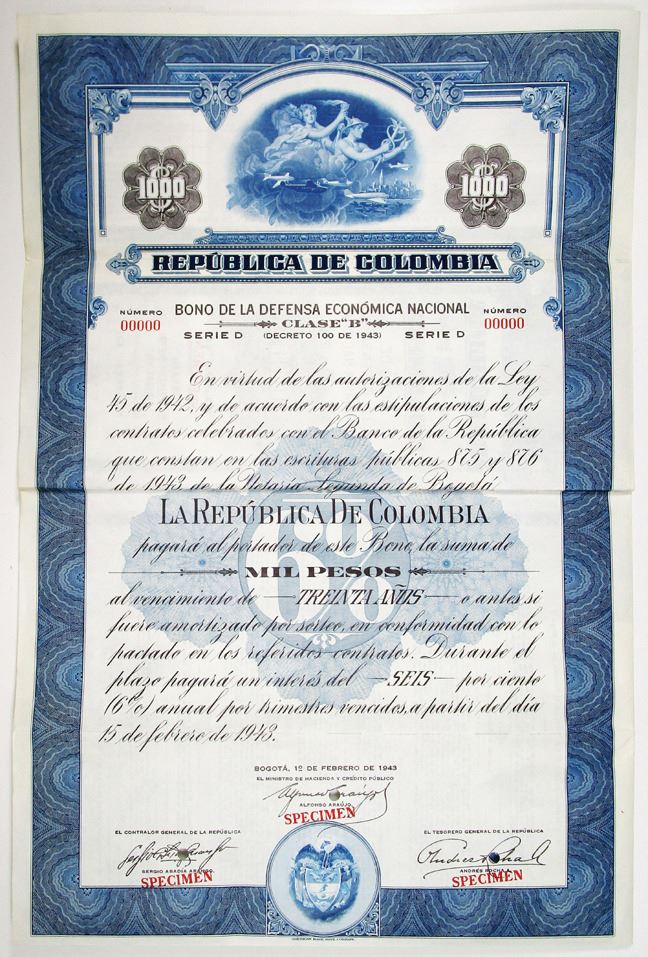 Colombia, 1943. 1000 Pesos Specimen 6% Economic Defense Coupon Bond in Spanish, Black text with blue border and undertint, Pair of allegorical figures above planes at top center. Red specimen overprints, 00000 serial numbers, and POCs. VF condition, ABNC.