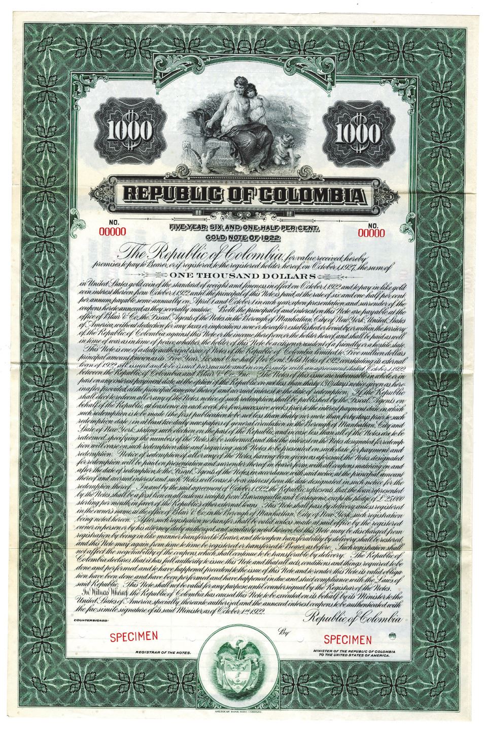 Bogota, Columbia. $1000 Specimen 6 1/2% Gold Coupon Bond, Black print on green border and under tint, Allegorical woman with children at top, Specimen overprints and POC's, VF-XF condition, ABNC.