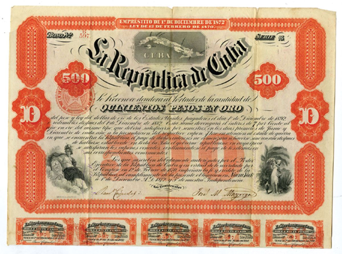 New York and Cuba. 1872. 500 Pesos, 7% I/U bond, "Emprestito De 1 De Diciembre de 1872 - Ley De 12 De Febrero De 1870", Black on green underprint and border, Map of Cuba on top middle, allegorical women on lower left and right, yellow seal on left middle, coupons attached, Cert.# 6/597, overall the bond appears VF to almost XF condition with bright colors and only light toning in spots and a vertical fold line in middle keeping this from XF. CBNC. Rare and early Cuba bond.