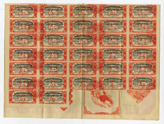 New York and Cuba. 1872. 500 Pesos, 7% I/U bond, "Emprestito De 1 De Diciembre de 1872 - Ley De 12 De Febrero De 1870", Black on green underprint and border, Map of Cuba on top middle, allegorical women on lower left and right, yellow seal on left middle, coupons attached, Cert.# 6/597, overall the bond appears VF to almost XF condition with bright colors and only light toning in spots and a vertical fold line in middle keeping this from XF. CBNC. Rare and early Cuba bond.