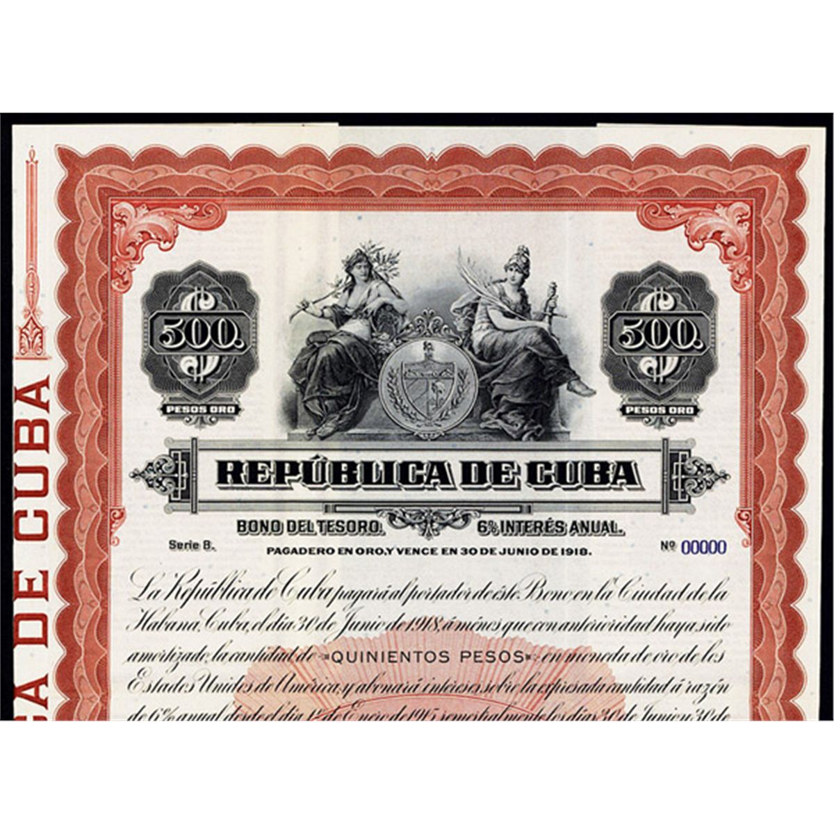 Havana, Cuba, 1915, Vertical $500 6% per annum bond, specimen certificate, brown border with allegorical women flank Arms of Cuba, specimen overprints, POCs, ABNC, XF condition.