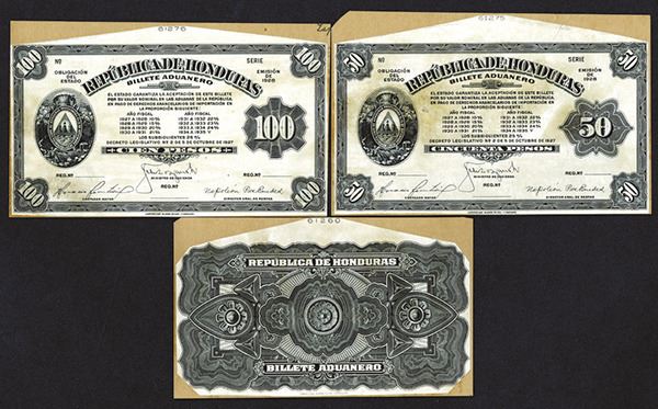 Honduras. 1, 2, 5, 10, 50, 100 Pesos. P-S162-S165B. ABNC File india paper proofs in black of each face, plus one of the back, each mounted on tightly trimmed file folder. Some with light glue tone visible. 7 pieces.
