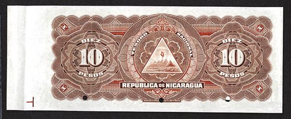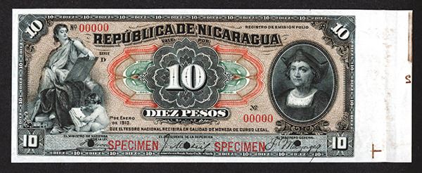 Nicaragua. 10 Pesos. P-46as for type, unlisted in this form. Female and child at left, Columbus at right. Red SPECIMEN overprint and POCs. Wide right margin, folded long ago. Otherwise Choice Uncirculated with some ink rub off on the wide margin not affecting the image area.