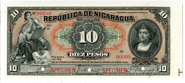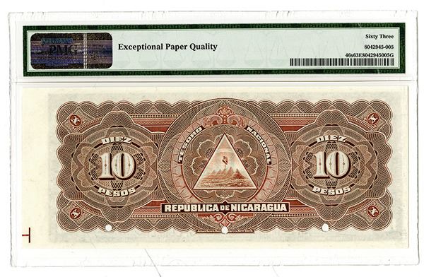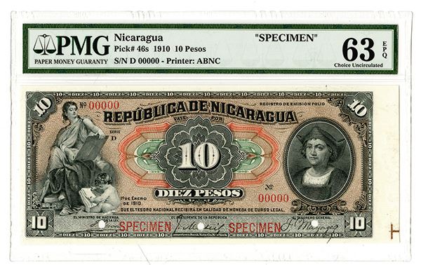 Nicaragua. 10 Pesos. P-46s. Female and child at left, Columbus at right. Red SPECIMEN overprint and POCs. Large right margin. PMG graded Choice Uncirculated 63 EPQ, ABNC.