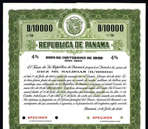 Panama, 1950, 10000 Balboas, 4% Specimen Bond, Black on dark green border and underprint, Country Seal top center, POC's and red SPECIMEN overprints, VF-XF condition, HBNC.