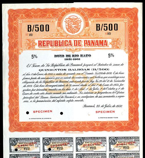 Panama, 1950, 500 Balboas, 5% Specimen Bond, Black on orange border and underprint, Country Seal top center, POC's and red SPECIMEN overprints, VF-XF condition, HBNC.