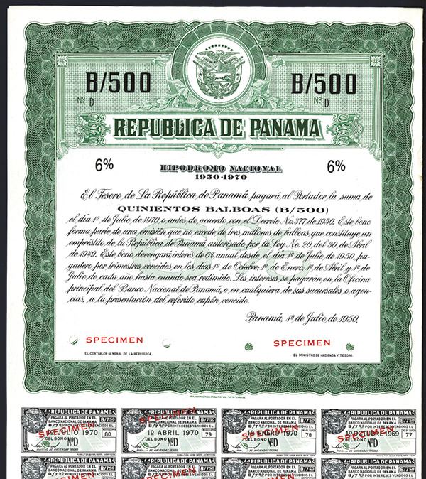 Panama, 1950, 500 Balboas, 6% Specimen Bond, Black on green border and underprint, Country Seal top center, POC's and red SPECIMEN overprints, VF-XF condition, HBNC.