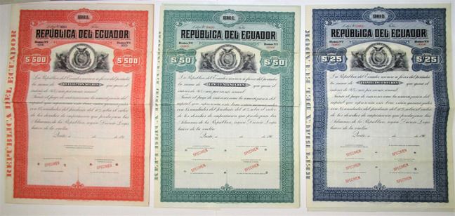 Ecuador, 1900-19. Lot of 3 Specimen 6% Coupon Bonds, Arms of Ecuador at top center, Includes: 25, 50, and 500 Sols in Blue, Green, and Orange. All have Specimen overprints and POC's. VF-XF condition. (3).
