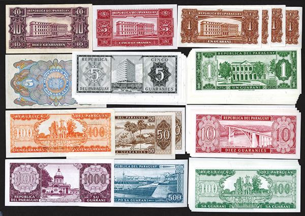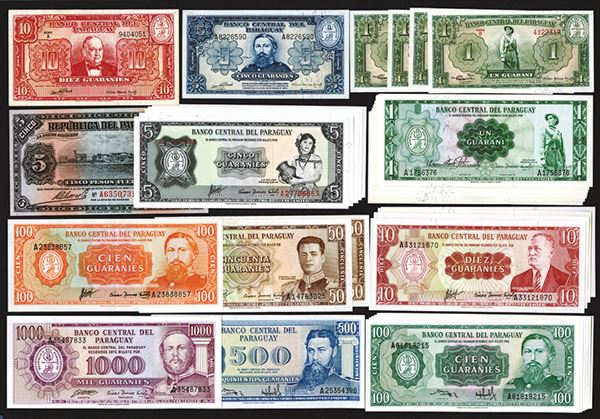 Paraguay. 5 Pesos. P-163a; 1, 5, 10, 50, 100, 500, 1000 Guaranies. P-185b; 186c; 187b; 192 (2); 193a (7, b; 195b (5); 196a (2), b (2); 197a, b; 199b; 205 (6); 200b; 201b. All but the first is Choice Uncirculated. 38 pieces.