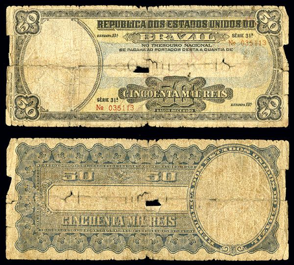 Brazil, issued note, 50 Mil Reis, E. 13A (1915), P-55a, Good condition with handwritten signature.