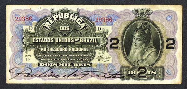 Brasil. 2 Mil Reis. P-11a. Woman at right end. Estampa 9a. Colorful underprint. ABNC. Very Fine, edge tone and rust.