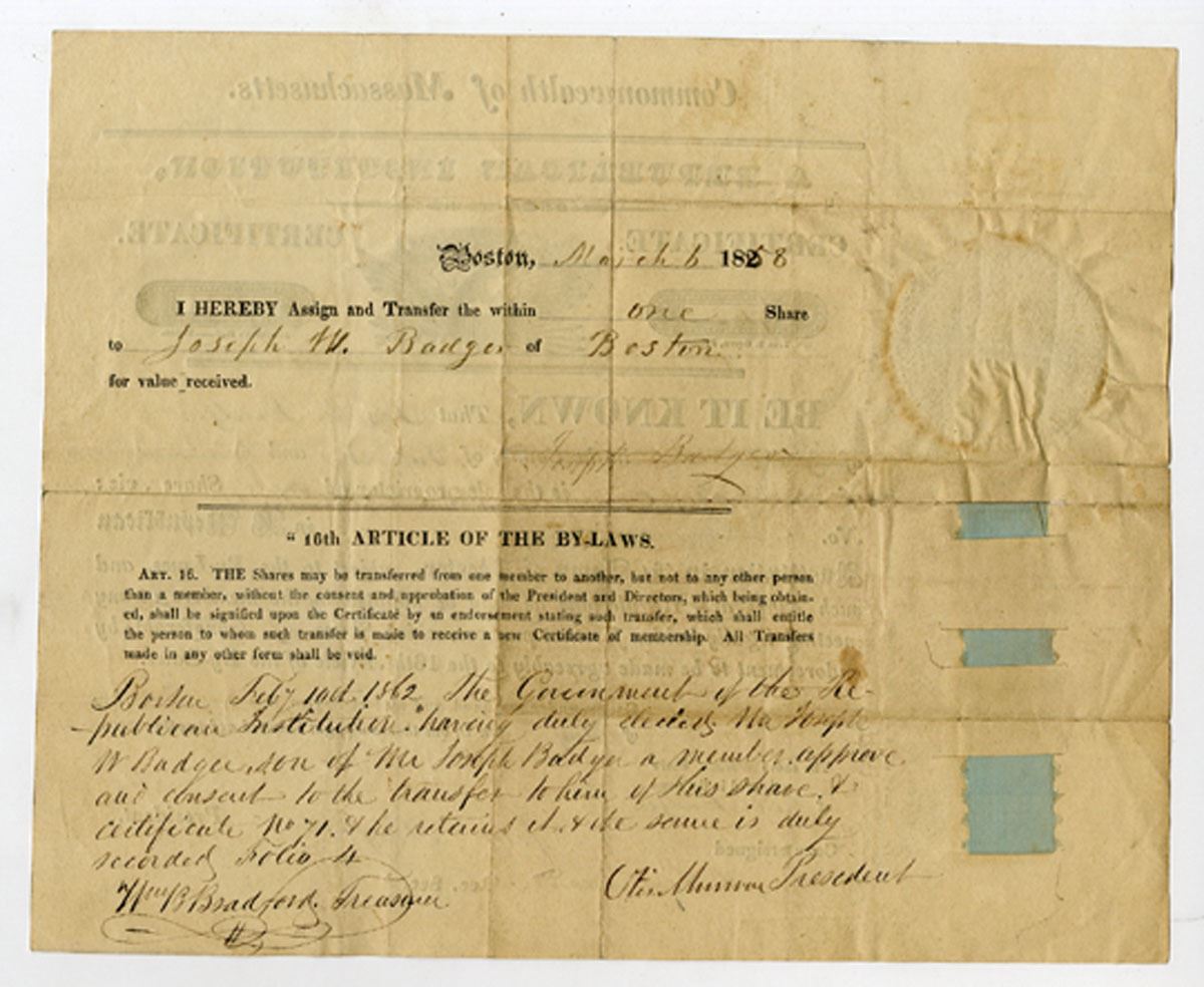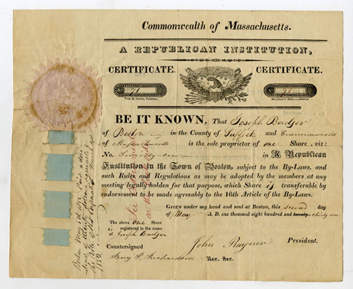 Massachusetts, 1831. 1 Share Common Stock I/U Certificate, Black print without any border and small State Seal of Pennsylvania at center, Blue ribbon with red seal weaved into left margin, S/N 71, VF condition, True & Green Printers. The Republican Institution in the Town of Boston was incorporated in 1819, it appears that the Institution was formed because, in the language of the subscription paper, it was deemed to be "absolutely necessary that the Republicans of the Town of Boston should be possessed of some respectable building wherein they may meet together to transact their business, and also a place to receive their Brethren from all parts of the Union." The meetings of the Institution were at first held at the "Old Court House," at the "Market Hotel," and at "Davidson's." In March, 1822, a room in the "Merchant Hall" Building was hired, and fitted up. This room is called in the records the "Corporation Room"; and meetings were held there until 1830, when this room was given up. From 1830 until 1840 meetings were held at "Concert Hall"; from 1840 to 1855 at the "Bromfield House"; from 1856 to 1886 at the "Parker House"; and since 1886 they have been held at "Young's Hotel," except that in 1887 the annual meeting was held at the "Tremont House."