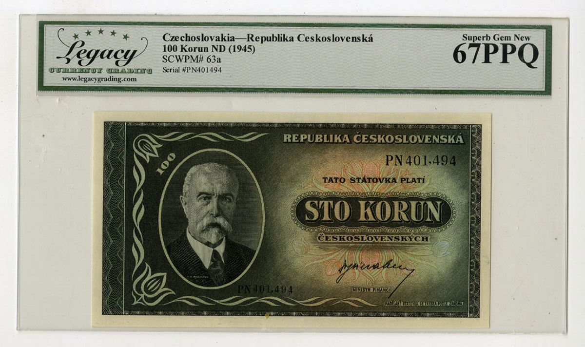 Czechoslovakia, ND (1945).. 100 Korun, P-63a, Issued Banknote, Black-green on orange and green underprint, Portrait of President Tomas G. Masaryk at left, Back is dark gray with Hradcany and Charles Bridge at center, S/N PN401494, Legacy graded Superb Gem New 67PPQ, BWC.