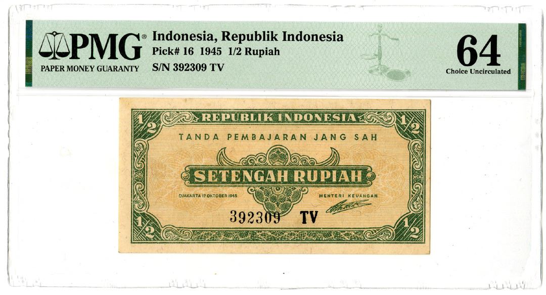 Indonesia. 1945. 1/2 Rupiah, P-16, Issued banknote, Green on pale peach, S/N 392309 TV, PMG graded Choice Uncirculated 64.