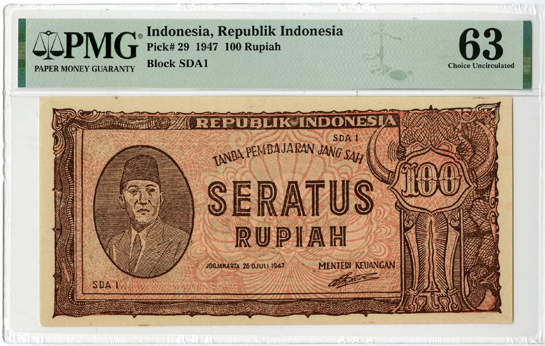 Indonesia, 1947. 100 Rupiah, P-29, Issued Banknote, Brown on brown-orange/pink underprint Block SDA1, PMG graded Choice uncirculated 63.