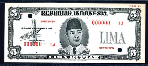 5 Rupiah, P-Unlisted5a, Essay specimen banknote of a Security BNC proposed and never issued 1948 Indonesia banknote Series. Note is dated September 1, 1948; Block 1-A. Red specimen overprints, POC's and “00000” serial numbers. Small red printing on upper right margin of face reads “ 11-9-48 FH” and back “11-9-48 BK. Front is black, back is olive green. Back of note has farmer plowing with oxen. PMG graded Choice Uncirculated 64, Rare essay note. SBNC.