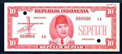 10 Rupiah, P-Unlisted10a, Essay specimen banknote of a Security BNC proposed and never issued 1948 Indonesia banknote Series. Note is dated September 1, 1948; Block 1-A. Red specimen overprints, POC's and “00000” serial numbers. Small red printing on upper right margin of face reads “ 11-9-48 FD” and back “11-9-48 BE. PMG graded Choice Uncirculated 64, Rare essay note. SBNC.