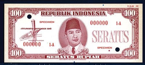 100 Rupiah, P-Unlisted100a, Essay specimen banknote of a Security BNC proposed and never issued 1948 Indonesia banknote Series. Note is dated September 1, 1948; Block 1-A. Red specimen overprints, POC's and “00000” serial numbers. Small red printing on upper right margin of face reads “ 11-9-48 FE” and back “11-9-48 BE. PMG graded Choice Uncirculated 64, Rare high grade essay note. SBNC.