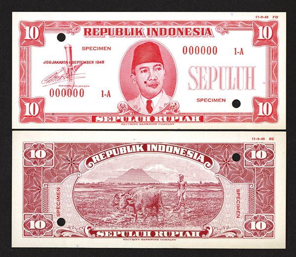 Indonesia. September 1, 1948, 10 Rupiah, P-Unlisted10a, Essay specimen uniface front and back banknotes. Block 1-A. Specimen overprints and POC's. Front is red with Sukarno's portrait, back is burgundy with farmer plowing with oxen. Choice to Gem Uncirculated, Rare essay note. SBNC.