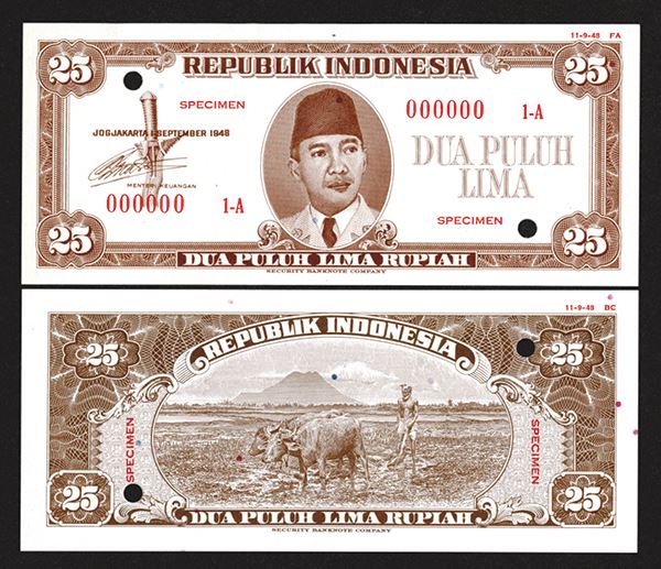 Indonesia. September 1, 1948, 25 Rupiah, P-Unlisted25a, Essay specimen uniface front and back banknotes. Block 1-A. Specimen overprints and POC's. Front is brown with Sukarno's portrait, back is brown with farmer plowing with oxen. Choice to Gem Uncirculated, Rare essay note. SBNC.