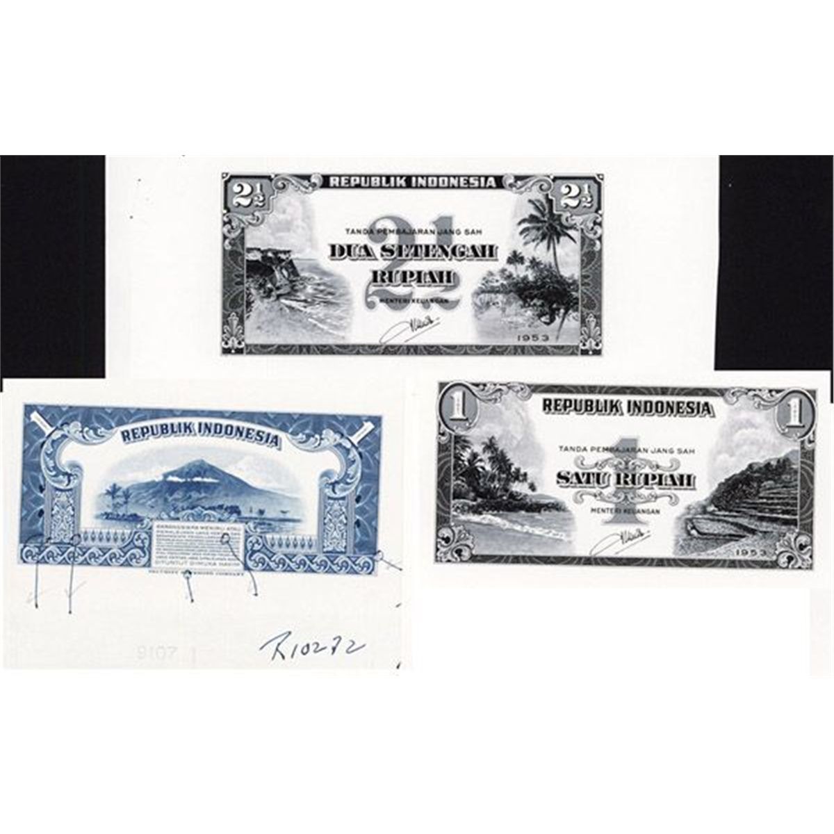 Indonesia, 1953, Lot of 3 items, all printed on glossy paper, Includes 1 Rupiah, P-40 printed in black instead of issued blue, 2 1/2 Rupiah, P-41, Printed in black instead of issued orange, and 1 Rupiah, P-40 proof back in blue. All on large margined paper with plate numbers, all are between AU and CU condition, the back with archival notations. SBNC. Rare trio of Indonesia proofs.